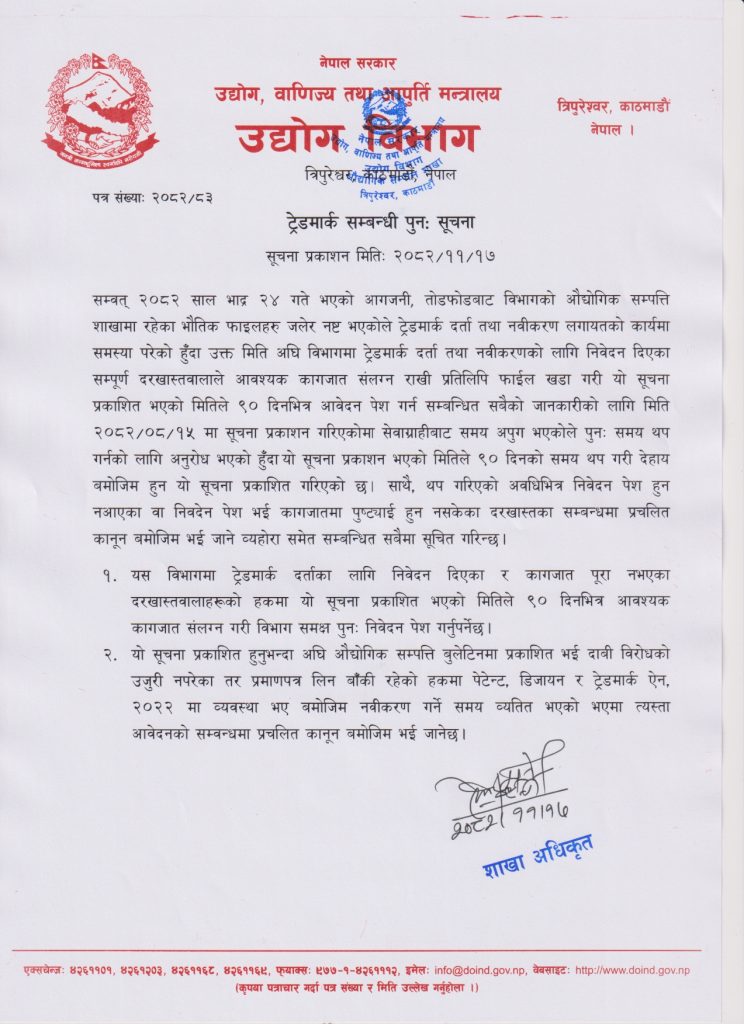 Incident: On 09/09/2025 (Bhadra 24, 2082), physical trademark records were destroyed.